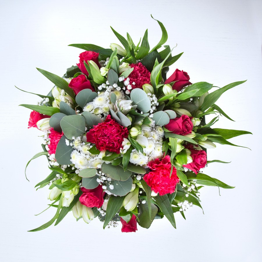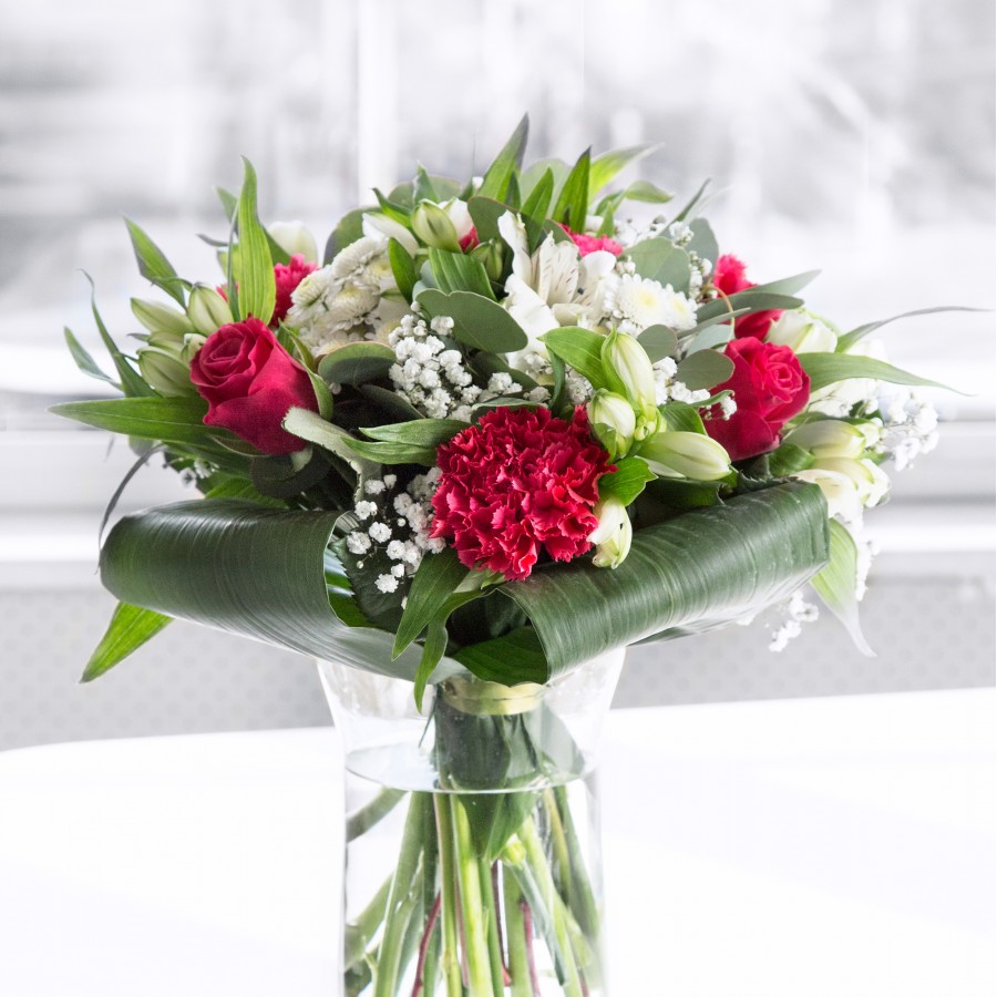 Add vibrancy to any setting with our vibrant bouquet, showcasing white chrysanthemums, light gypsophila, dazzling red roses, and delightful carnations, harmoniously arranged with white alstroemeria and refined aspidistra leaves.